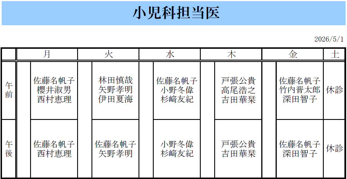5月1日から小児科外来の担当医が一部変更となりますので、お知らせいたします。